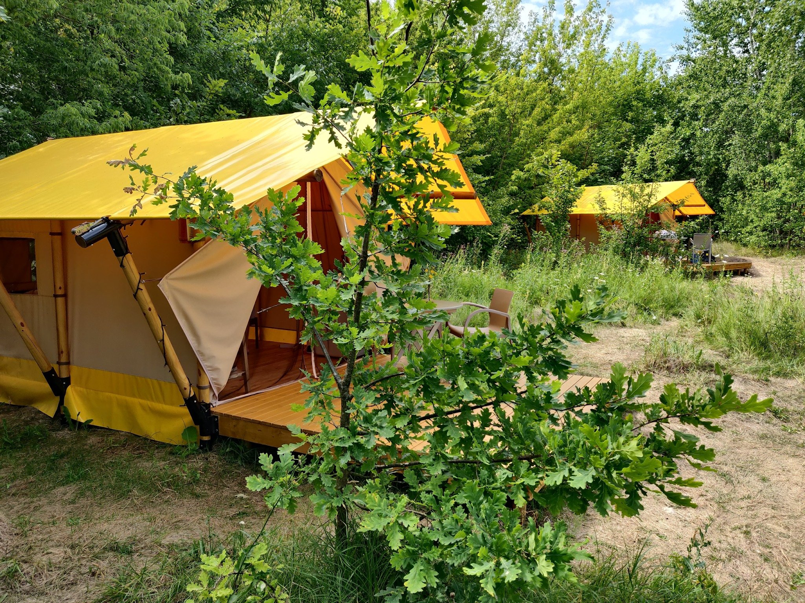 На территории располагается 10 шатров, в каждом из которых установлена удобная двуспальная кровать, холодильник, шкаф для вещей, комплект посуды, полотенца и розетки, проведено освещение. Рядом с каждой палаткой есть летняя терраса с мебелью и зоной барбекю. На всей территории работает бесплатный Wi-Fi. Также отдельно есть общий душ с теплой водой, туалеты и умывальники.